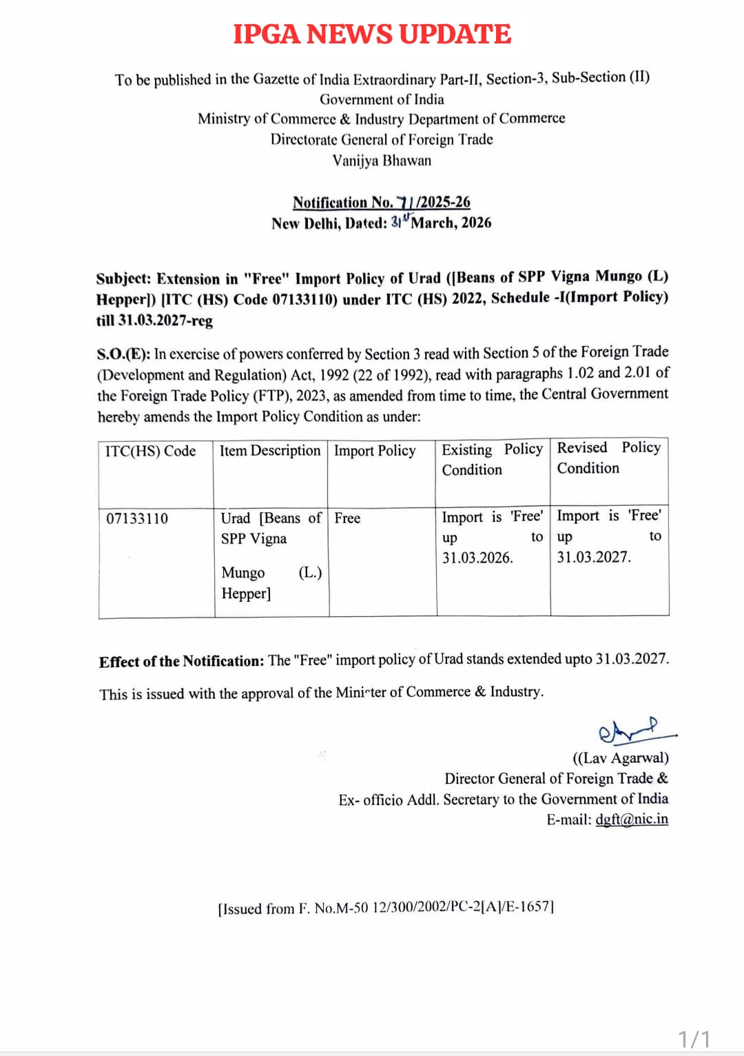 देश के दाल बाजार के लिए एक महत्वपूर्ण निर्णय लेते हुए Ministry of Commerce & Industry के अंतर्गत Directorate General of Foreign Trade (DGFT) ने तूर (अरहर) के आयात को “फ्री” श्रेणी में रखने की अवधि को एक वर्ष के लिए और बढ़ा दिया है। 31 मार्च 2026 तक लागू यह नीति अब 31 मार्च 2027 तक प्रभावी रहेगी।